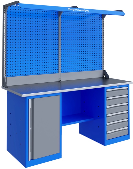 Верстак слесарный двухтумбовый TNC 181.67.2-2F серии Technic состоит из столешницы шириной 1796 мм, тумбы P6 с шестью малыми ящиками, тумбы P7 с дверью и двумя полками, полки-стенки, двойного экрана с кронштейнами и комплекта освещения.